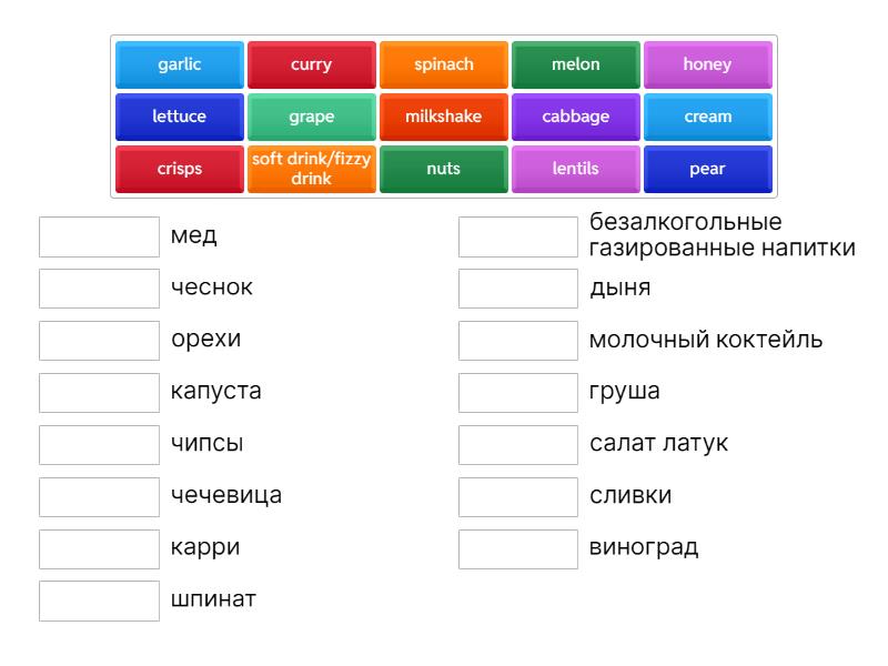 cabbage - капуста , cream - сливки, crisps - чипсы , curry - карри, garlic - чеснок, grape - виноград, lentils - чечевица, lettuce - салат латук , melon - дыня , nuts - орехи, pear - груша , soft drink/fizzy drink - безалкогольные газированные напитки, spinach - шпинат , honey - мед, milkshake - молочный коктейль ,