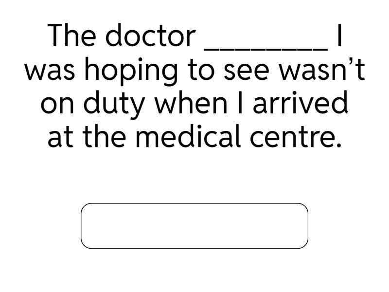 The abstract painting ________ was damaged by yesterday’s fire is being repaired., The place ________ the lorry had been abandoned was a pedestrian precinct., The reason ________ I came here early this morning is not of any significance., The doctor ________ I was hoping to see wasn’t on duty when I arrived at the medical centre., The woman ________ spoke at the meeting was very knowledgeable., That’s the owner ________ vicious dog ferociously attacked the postman..