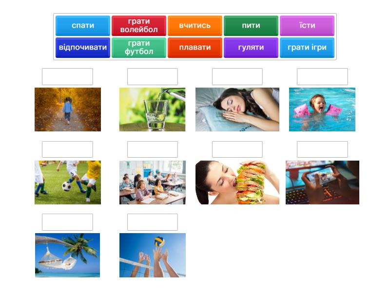 їсти, плавати, гуляти, вчитись, пити, відпочивати, спати, грати футбол, грати волейбол, грати ігри,