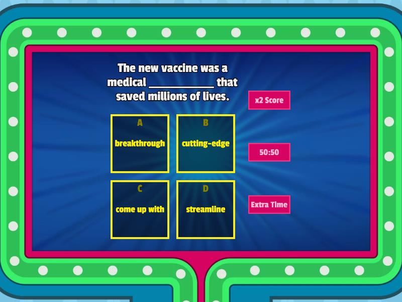 1) The new vaccine was a medical ____________ that saved millions of lives. a) breakthrough b) cutting-edge c) come up with d) streamline 2) This company always invests in ___________ technology to stay ahead of competitors. a) bottleneck b) cutting-edge c) streamline d) approachable 3) The project sounds interesting, but is it really _______ with our current resources? a) approachable b) streamline c) bottleneck d) feasible 4) The team needs to __________ with a creative idea for reducing production costs. a) come up b) feasible c) streamline 5) The manager asked us to___________ our workflow to make it faster and easier. a) feasible b) streamline c) come up 6) The research team will ____________________ with a new strategy to improve customer satisfaction. a) approachable b) streamline c) come up 7) Solar panels are becoming more ____________ and efficient every year. a) feasible b) bottleneck c) cutting-edge 8) The student invented a _____________ device that could detect pollution in real time. a) Breakthrough b) cutting-edge c) approachable