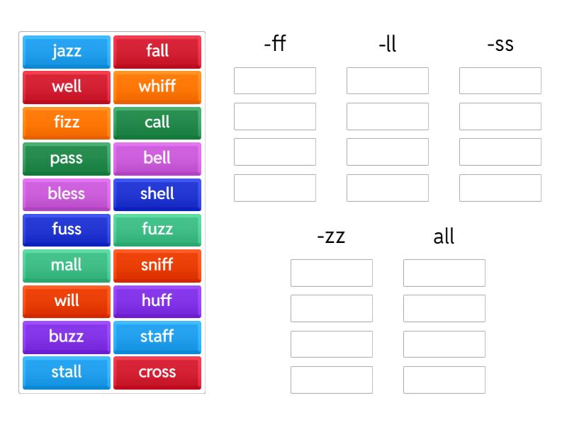 -ff: huff, whiff, sniff, staff, -ll: will, bell, shell, well, -ss: pass, cross, bless, fuss, -zz: jazz, buzz, fuzz, fizz, all: mall, stall, call, fall,