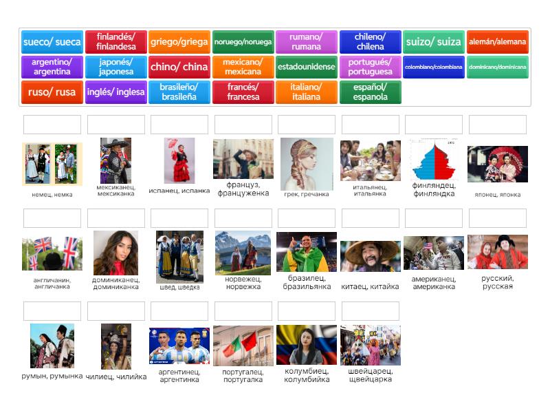 español/ espanola - испанец, испанка, brasileño/ brasileña - бразилец, бразильянка, mexicano/ mexicana - мексиканец, мексиканка, argentino/ argentina - аргентинец, аргентинка, italiano/ italiana - итальянец, итальянка, chileno/ chilena - чилиец, чилийка, estadounidense - американец, американка, inglés/ inglesa - англичанин, англичанка, francés/ francesa - француз, француженка, portugués/ portuguesa - португалец, португалка, alemán/alemana - немец, немка, sueco/ sueca - швед, шведка, chino/ china - китаец, китайка, ruso/ rusa - русский, русская, suizo/ suiza - швейцарец, щвейцарка, griego/griega - грек, гречанка, dominicano/dominicana - доминиканец, доминиканка, colombiano/colombiana - колумбиец, колумбийка, japonés/ japonesa - японец, японка, rumano/ rumana - румын, румынка, finlandés/ finlandesa - финляндец, финляндка, noruego/noruega - норвежец, норвежка,