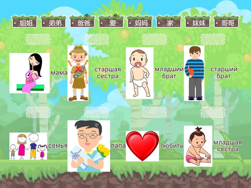 爸爸 - папа, 妈妈 - мама , 姐姐 - старшая сестра, 妹妹 - младшая сестра, 哥哥 - старший брат, 弟弟 - младший брат, 家 - семья, 爱 - любить,