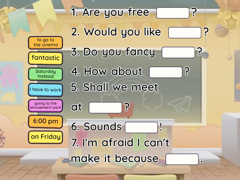 1. Are you free ____? 2. Would you like ____? 3. Do you fancy ____? 4. How about ____? 5. Shall we meet at ____? 6. Sounds____! 7. I'm afraid I can't make it because ____. 1. ____ next weekend? 2. ____ playing football? 3. ____ to visit a museum? 4. ____ the door of the cinema? 5. ____ going to a discoteque instead? 6. ____ it's my father's birthday. 7. ____ great!