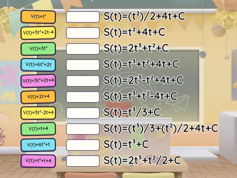 V(t)=3t²+2t+4 - S(t)=t³+t²+4t+C, V(t)=t²+t+4 - S(t)=(t³)/3+(t²)/2+4t+C, V(t)=t+4 - S(t)=(t²)/2+4t+C, V(t)=2t+4 - S(t)=t²+4t+C, V(t)=3t² - S(t)=t³+C, V(t)=t² - S(t)=t³/3+C, V(t)=6t²+2t - S(t)=2t³+t²+C, V(t)=6t²+t - S(t)=2t³+t²/2+C, V(t)=3t²-2t+4 - S(t)=2t³-t²+4t+C, V(t)=3t²+2t-4 - S(t)=t³+t²-4t+C,