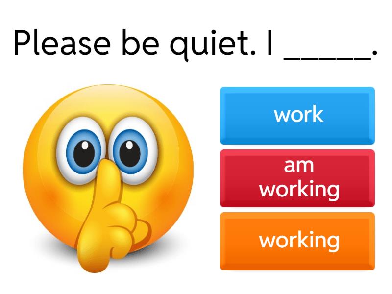 1) Please be quiet. I _____. a) work b) am working c) working 2) A: Is John at home? B: Yes, he's in the kitchen, he _____. a) cook b) is cooking c) is cook 3) A: Where's Ann? B: I ____ . a) not know b) am not knowing c) don't know 4) A: Where's Ann? B: She ____ a shower right now a) have b) is having c) has 5) A: What____? B: She's a dentist. a) does your sister do b) is your sister doing c) your sister does 6) A: You ____ on my foot! B: Oh, I'm sorry! a) stand b) are standing c) are stand 7) It ____, I ____ to go out in the rain. a) rain, am not wanting b) rains, don't want c) is raining, don't want 8) A: Where ____ from? B: Canada. a) do you come b) are you come c) you come 9) Listen! Somebody ____ a) sings b) sing c) is singing 10) What ____ ? ____? a) is it meaning? Are you understanding? b) does it mean? Do you understand? c) is it mean? Are you understand? 11) Ann ____ happy at the moment. a) doesn't seem b) isn't seeming c) not seeming 12) What ____ about my new shirt? a) are you thinking b) you think c) do you think 13) I ____ of selling my car. Would you like to buy it? a) think b) am thinking c) thinks 14) Who's that man? What ____? a) does he want b) he is wanting c) is he wanting 15) Who's that man? Why ____ at us? a) does he look b) he is looking c) is he looking 16) The dinner ____ very good! I'm sure the taste is good, too. a) is smelling b) smells c) smell 17) ____ that man over there? a) Do you see b) You are see c) Are you seeing 18) She told me her name, but I ____ it now. a) not remember b) am not remembering c) don't remember 19) These gloves are too small, they _____ me. a) aren't fit b) don't fit c) not fit 20) Don't turn the computer off. I ____ to use it. a) need b) am need c) am needing