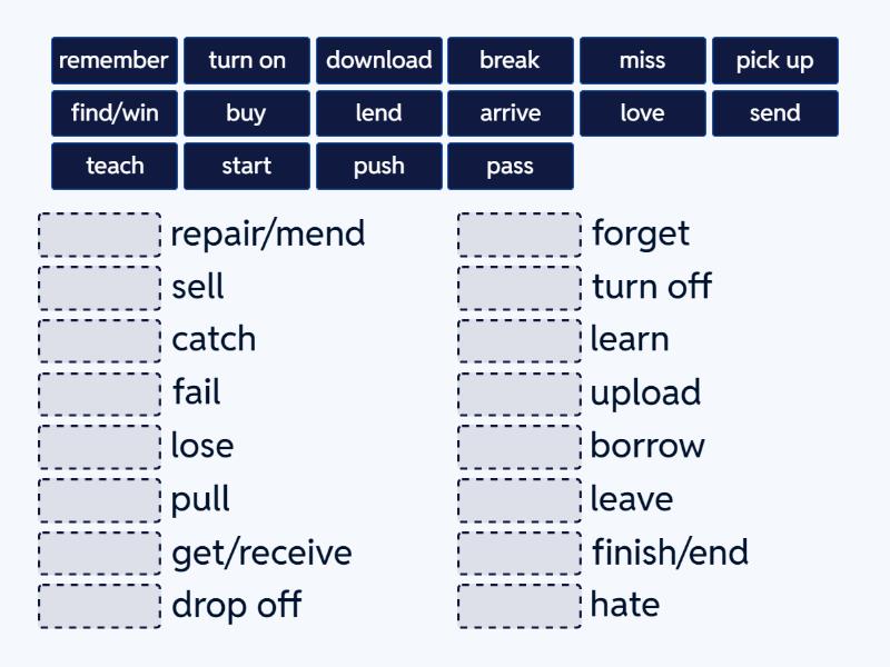 find/win - lose, send - get/receive, remember - forget, start - finish/end, turn on - turn off, arrive - leave, break - repair/mend, buy - sell, download - upload, lend - borrow, love - hate, miss - catch, pass - fail, pick up - drop off, push - pull, teach - learn,