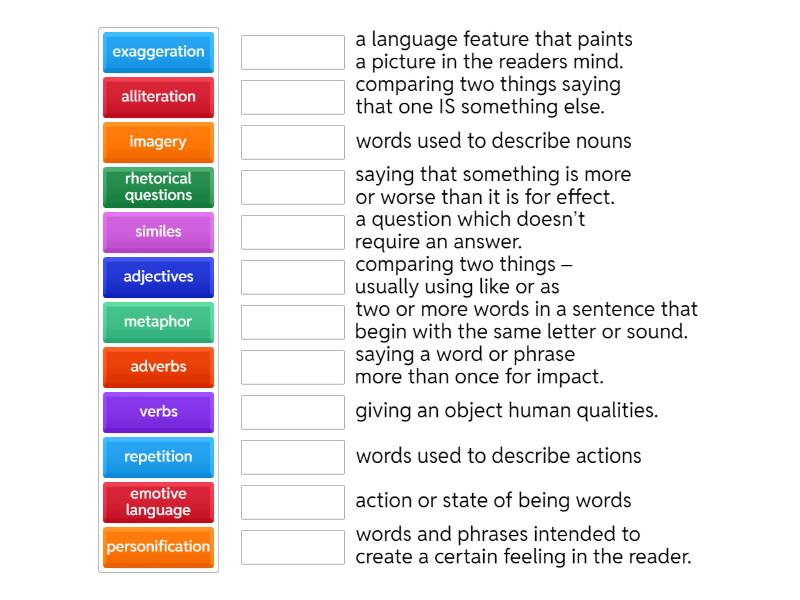 verbs - action or state of being words, adjectives - words used to describe nouns, adverbs - words used to describe actions, alliteration - two or more words in a sentence that begin with the same letter or sound., metaphor - comparing two things saying that one IS something else., personification - giving an object human qualities., imagery - a language feature that paints a picture in the readers mind., rhetorical questions - a question which doesn’t require an answer., repetition - saying a word or phrase more than once for impact., exaggeration - saying that something is more or worse than it is for effect., emotive language - words and phrases intended to create a certain feeling in the reader., similes - comparing two things – usually using like or as,