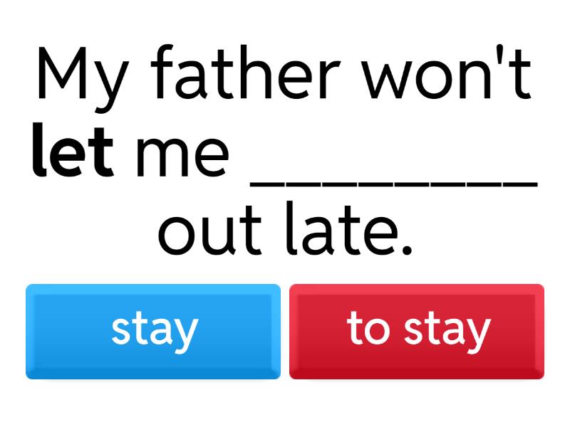 1) My father won't let me ________ out late. a) stay b) to stay 2) I can't get him __________ up his room. a) clean b) to clean 3) My parents make me _______ my homework when I come home after school. a) do b) to do 4) My brother never helps me __________ the bedroom. a) clean b) to clean 5) My parents want me __________ medicine. a) study b) to study 6) I have to ask them __________ me to school. a) drive b) to drive 7) My wife is always telling me ______________ a) slow down b) to slow down 8) My mother has me _______ my homework after school. a) do b) to do 9) I don’t let my kids _________ violent movies. a) watch b) to watch 10) I’ll have my assistant ________ you to reschedule the appointment. a) call b) to call 11) How can we get all the employees _______ on time? a) arrive b) to arrive 12) He helped me __________ the boxes. a) carry b) to carry 13) My teacher made me _________ for what I had said. a) apologize b) to apologize 14) My boss told me ________ more. a) work b) to work 15) My mom asks me ________ more. a) study b) to study