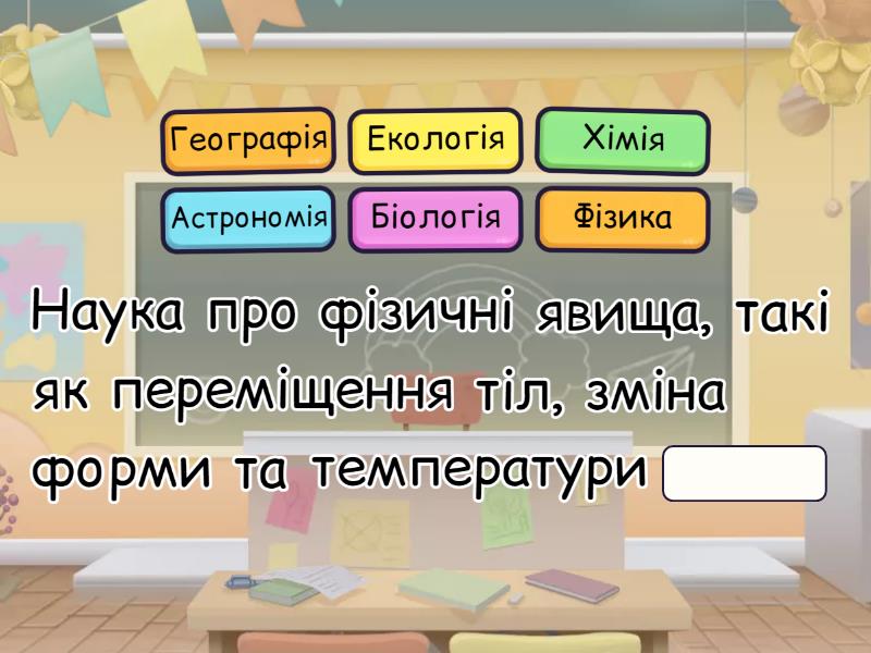 Наука про фізичні явища, такі як переміщення тіл, зміна форми та температури____ Наука про живе, що вивчає різні біологічні процеси у живих організмах____ Наука про взаємовідносини організмів та їх з середовищем____ Комплексна наука, яка вивчає природу Землі, населення та його господарську діяльність ____ Наука про речовини, їх склад, будову, властивості та перетворення.____