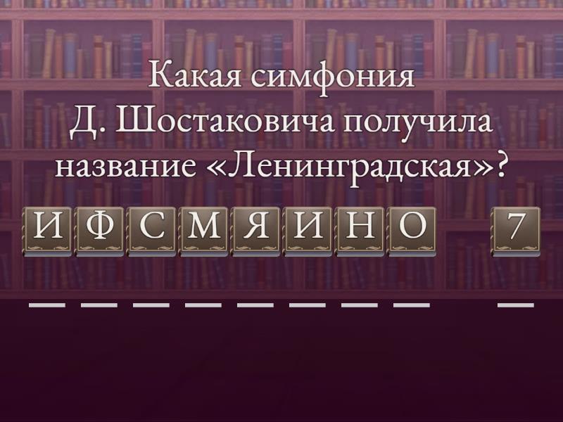 СИМФОНИЯ 7 - Какая симфония Д. Шостаковича получила название «Ленинградская»?, СЛАВЬСЯ - Какое произведение Глинки стало символом патриотической музыки?, АЛЕКСАНДР НЕВСКИЙ - Назовите кантату С. Прокофьева, посвящённую русскому князю-защитнику?, ШОСТАКОВИЧ - Какой композитор написал «Ленинградскую симфонию»?, ДЕНЬ ПОБЕДЫ - Какая песня Д. Тухманова стала символом Победы?, ХОР - Какой жанр объединяет исполнителей и звучит особенно мощно в патриотической музыке?, ЩЕЛКУНЧИК - Какой балет П. Чайковского не является патриотическим?, ЖУРАВЛИ - Какая песня Я. Френкеля и Р. Гамзатова стала символом памяти о погибших солдатах?, ГИМН - Какое музыкальное слово объединяет народ и символизирует страну?, ГЛИНКА - Кто считается «отцом русской классической музыки»?, ГЕРОЙ - Какое слово связано с подвигами, воспетыми в музыке?, ПЕСНЯ - Какое музыкальное произведение может быть патриотическим и народным одновременно?, ЧАЙКОВСКИЙ - Какой великий русский композитор создал множество симфоний, концертов и балетов?, ЛЕНИНГРАД - Как называется город, в честь которого создана 7-я симфония Шостаковича?, АЛЕКСАНДРОВ - Какой композитор написал гимн Российской Федерации?, МАРШ - Как называется жанр военной музыки, который сопровождает шаг солдат?, ПАТРИОТИЗМ - Какое слово обозначает любовь к своей Родине?,