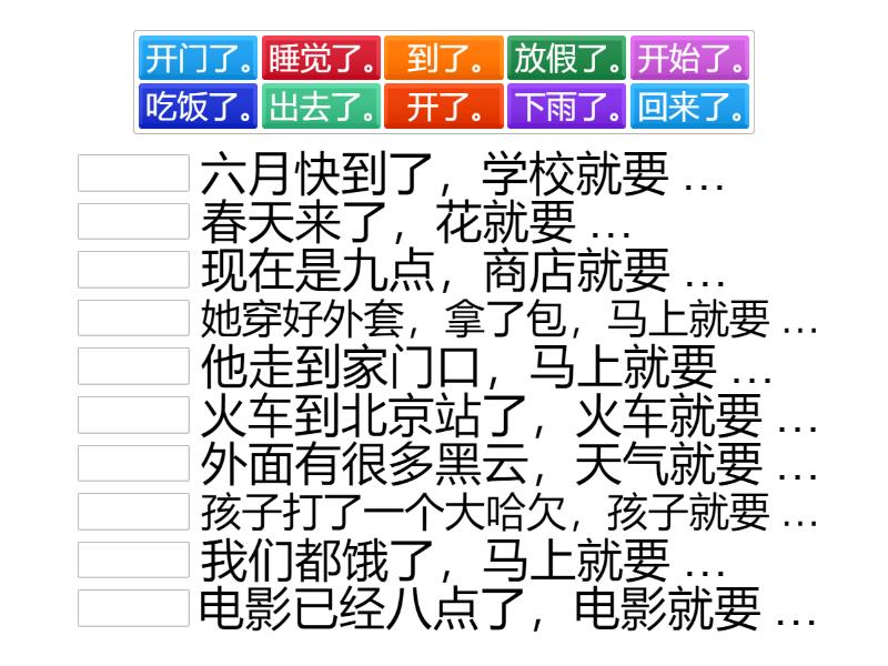 下雨了。 - 外面有很多黑云,天气就要 …, 吃饭了。 - 我们都饿了,马上就要 …, 到了。 - 火车到北京站了,火车就要 …, 回来了。 - 他走到家门口,马上就要 …, 开始了。 - 电影已经八点了,电影就要 …, 开了。 - 春天来了,花就要 …, 睡觉了。 - 孩子打了一个大哈欠,孩子就要 …, 放假了。 - 六月快到了,学校就要 …, 出去了。 - 她穿好外套,拿了包,马上就要 …, 开门了。 - 现在是九点,商店就要 …,