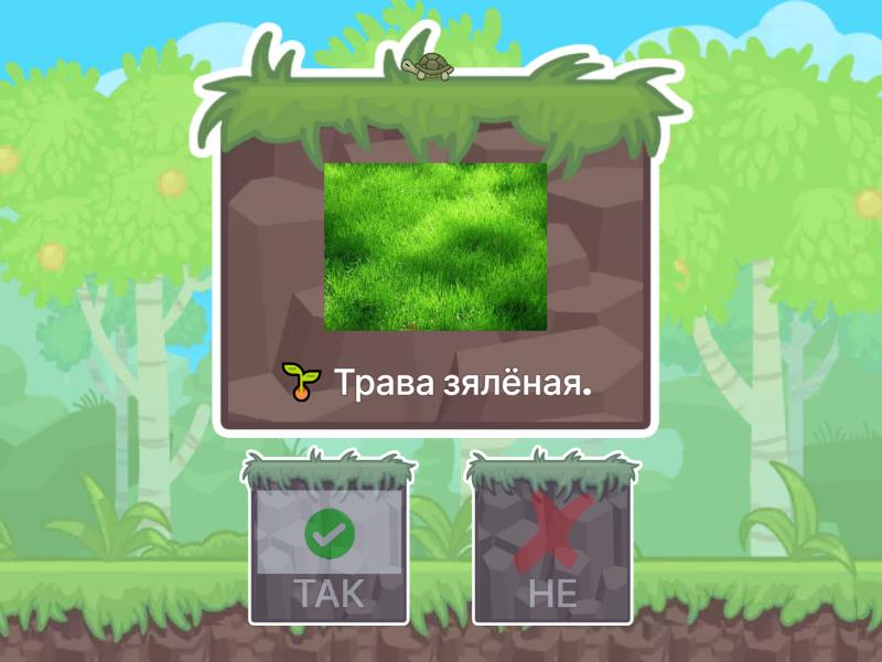 ТАК: 🌱 Трава зялёная., ☀️ Сонца свеціць удзень., 🌙 Месяц свеціць ноччу., 🚀 Ракета ляціць у космас., 🐸 Жаба квакае., НЕ: 🐱 Кацяня ўмее лётаць., 🐄 Карова носіць капялюш., 🍎 Яблык гаворыць., 🐠 Рыба ходзіць па сушы., ❄️ Зімою птушкі прылятаюць,