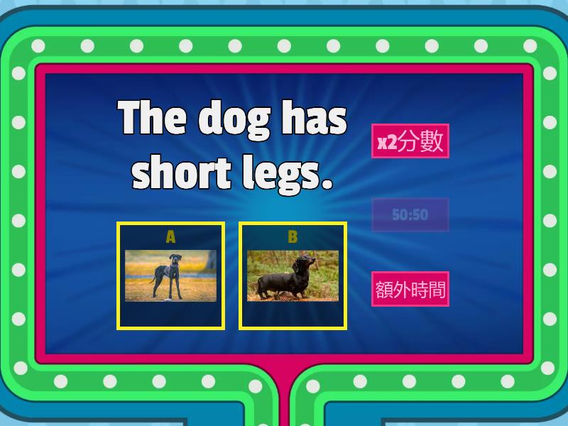 1) The dog has short legs. a) b) 2) Does it have a long tail? a) Yes, it does. b) No, it doesn't. 3) Does it have long hands? a) Yes, it does. b) No, it doesn't. 4) He has a big nose. a) b) 5) It doesn't have a tail. a) b) 6) Does she have small eyes? a) Yes, she does. b) No, she doesn't. 7) I don't like beans. a) b) 8) pasta a) b) 9) pizza a) b) 10) Where's my teddy bear? a) In the kitchen b) In the living room 11) Where's my yellow plane? a) In the bedroom b) In the bathroom. 12) The ball is on the chair. a) b) 13) Where's the rabbit? a) It's in the closet. b) It's in the bag. 14) The book is under the bed. a) b) 15) Where are the shoes? a) They're under the table. b) They're under the table. 16) There are crocodiles at the zoo. a) b) 17) There are three monkeys. a) b) 18) There are eight parrots. a) b) 19) Do you have a car? a) Yes, I do. b) No, I don't.