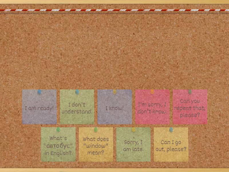 I don't understand. - Ты не понимаешь задание. Что ты скажешь?, Can you repeat that, please? - Ты не услышал, что сказал учитель. Что ты скажешь?, I know! - Ты хочешь ответить на вопрос учителя. Что ты скажешь?, Can I go out, please? - Тебе нужно отлучиться в уборную. Что ты скажешь?, What's "автобус" in English? - Ты не знаешь как будет слово по английски. Что ты скажешь?, I'm sorry, I don't know. - Учитель задает тебе вопрос, но ты не знаешь на него ответ. Что ты скажешь?, I am ready! - Ты закончил выполнять упражнение. Что ты скажешь?, What does "window" mean? - Ты хочешь узнать значение нового слова. Что ты скажешь?, Sorry, I am late. - Урок начинается в 10:00, но уже 10:03. Что ты скажешь?,