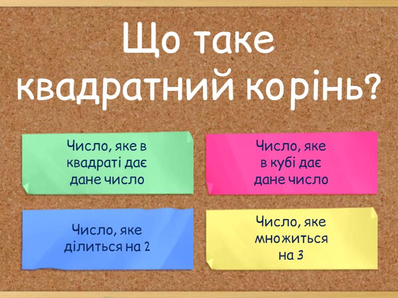 1) Що таке квадратний корінь? a) Число, яке в квадраті дає дане число b) Число, яке в кубі дає дане число c) Число, яке ділиться на 2 d) Число, яке множиться на 3 2) Яка формула для обчислення площі квадрата? a) a2 b) a*b c) 2a d) a+b 3) Що таке коефіцієнт? a) Сума чисел b) Число перед змінною c) Добуток чисел d) Різниця чисел 4) Яка формула для обчислення об'єму куба? a) a b) 3a2 c) a*b*c d) a+b+c 5) Яка формула для обчислення периметра прямокутника? a) (a+b) b) a*b c) a2 d) 2(a+b) 6) Що таке змінна? a) Символ, що позначає число b) Число, що ділиться на 2 c) Число, що множиться на 3 d) Число, що ділиться на 3 7) Яка формула для обчислення площі трикутника? a) a*b b) a2 c) (a*h)/2 d) a+b 8) Що таке добуток? a) Результат множення b) Результат додавання c) Результат віднімання d) Результат ділення 9) Яка формула для обчислення площі кола? a) 2πr b) πr2 c) πd d) 2πd 10) Що таке рівняння? a) Рівність з невідомими b) Сума чисел c) Добуток чисел d) Різниця чисел