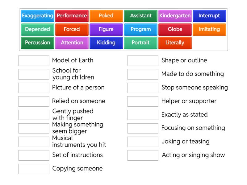 Attention - Focusing on something, Globe - Model of Earth, Assistant - Helper or supporter, Kidding - Joking or teasing, Imitating - Copying someone, Interrupt - Stop someone speaking, Portrait - Picture of a person, Exaggerating - Making something seem bigger, Literally - Exactly as stated, Poked - Gently pushed with finger, Figure - Shape or outline, Depended - Relied on someone, Program - Set of instructions, Forced - Made to do something, Kindergarten - School for young children, Performance - Acting or singing show, Percussion - Musical instruments you hit,