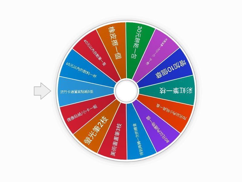 1) 65元以內的飲料一杯 2) 40元以內自動筆一隻 3) 橡皮擦一個 4) 30元餅乾一包 5) 作業減量一次(少一行、少一題) 6) 增加10個章 7) 彩虹筆一枝 8) 70元以內小玩具一盒 9) 80元以內禮物一個 10) 得到再轉一次的機會 11) 美術畫畫筆3枝 12) 螢光筆2枝 13) 偶像貼紙/小卡一組 14) 流行卡通圖案貼紙5張