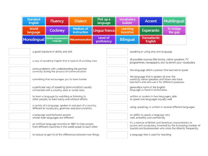 Standard English - generallya norm of the English language as fixed in dictionaries, World language - the language that is spoken all over the world by native speakers and those who have learned it and who use it for different purposes, Mother tongue/native language - the language which a person first learned to speak , Accent - a particular way of speaking (pronunciation) usually connected with a country, area or social class., Dialect - a variety of a language, spoken in one part of a country, different in vocabulary, grammar and pronunciation., Monolingual - speaking or using only one language, Bilingual - written or spoken in two languages; able to speak two languages equally well, Multilingual - using, speaking, or written in several different languages, Lingua franca - a language used between people whose main languages are different, Cockney - a way of speaking English that is typical of working class, Esperanto - an artificial language invented in 1887 to help people from different countries in the world speak to each other, Transatlantic English - It’s a mixture of British and American characteristics in accent and vocabulary, invented by the increasing number of tourists and businessmen who cross the Atlantic frequently., Fluency - an ability to speak a language very well, smoothly and confidently, To bridge the gap - to reduce or get rid of the differences between two things, Medium of instruction - a language that is used for teaching, Learning incentive - something that encourages you to learn harder, Level of proficiency - a good standard of ability and skill, Miscommunication - some problems with understanding the partner correctly during the process of communication, Vocabulary builder - all possible sources (like books, native speakers, TV programmes, newspapers, etc) to enrich your vocabulary, Pick up a language - to learn a language by watching or listening to other people, to learn easily and without efforts,