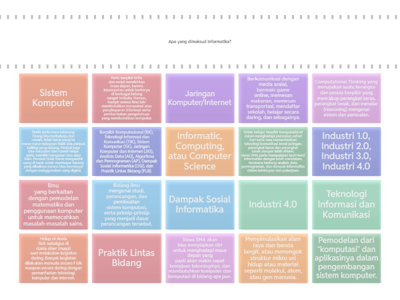 Bidang ilmu mengenai studi, perancangan, dan pembuatan sistem komputasi, serta prinsip-prinsip yang menjadi dasar perancangan tersebut. - Apa yang dimaksud Informatika?, Ilmu yang berkaitan dengan pemodelan matematika dan penggunaan komputer untuk memecahkan masalah-masalah sains. - Apa yang dimaksud komputasi?, Informatic, Computing, atau Computer Science - Istilah Informatika = ………………. (B.Inggris), Pemodelan dari “komputasi” dan aplikasinya dalam pengembangan sistem komputer. - Informatika mencakup?, Computational Thinking yang merupakan suatu kerangka dan proses berpikir yang mencakup perangkat keras, perangkat lunak, dan menalar (reasoning) mengenai sistem dan persoalan. - Landasan berpikir untuk belajar informatika yaitu?, Industri 1.0, Industri 2.0, Industri 3.0, Industri 4.0 - Empat revolusi industri?, Industri 4.0 - Saat ini manusia hidup di era digital yang sering disebut Industri?, Hidup di dunia fisik sekaligus di dunia siber (maya) saat melakukan kegiatan daring. Banyak kegiatan dilakukan manusia secara f isik maupun secara daring dengan pemanfaatan teknologi komputer dan internet. - Masyarakat sekarang ini disebut masyarakat 5.0 (society 5.0) karena ?, Berkomunikasi dengan media sosial, bermain game online, memesan makanan, memesan transportasi, mendaftar sekolah, belajar secara daring, dan sebagainya. - Pengalaman kalian yang didukung teknologi komputer dan internet?, Dunia pada masa sekarang: Orang bisa berbelanja dari rumah, tidak harus pergi ke mana-mana walaupun tidak ada penjual keliling yang datang. Penjual juga bisa berjualan dari rumah tanpa perlu memiliki bangunan kios atau toko. Pembeli tidak harus mengambil uang di bank untuk membayar barang yang dibelinya karena bisa membayar dengan menggunakan uang digital. - Dunia pada masa dahulu: Orang harus pergi ke toko atau ke pasar untuk berbelanja. Penjual juga harus mempunyai bangunan kios atau toko. Pemilik toko mempekerjakan pegawai untuk mengurus gudang, menjadi kasir, dan menangani berbagai pekerjaan lain. Pembeli juga harus membawa uang tunai untuk membayar., Perlu berpikir kritis dan mulai memikirkan masa depan, karena kesempatan untuk berkarya di berbagai bidang sangat terbuka. Namun, hampir semua ilmu lain membutuhkan komputasi atau penyimpanan informasi serta pembentukan pengetahuan yang membutuhkan komputer. - Tantangan pelajar SMA dalam perkembangan teknologi masa sekarang?, Menyimulasikan alam raya dan benda langit, atau menengok struktur mikro sel hidup atau material seperti molekul, atom, atau gen manusia. - Bidang-bidang apa saja yang semua sulit terjangkau untuk direset, makin tertolong dengan kemampuan komputasi?, Selain belajar berpikir komputasional dalam menghadapi persoalan sehari hari serta cara memanfaatkan teknologi komunikasi lewat jaringan, perangkat keras dan perangkat lunak dengan lebih efisien, siswa SMA perlu mempelajari teori-teori informatika dengan lebih mendalam, terutama tentang analisis data, pemrograman, dan dampak informatika dalam kehidupan dan pekerjaan. - Selain belajar berpikir komputasional apa saja pelajaran Informatika yang perlu dipelajari di SMA?, Siswa SMA akan bisa menyiapkan diri untuk menghadapi masa depan yang pasti akan makin cepat kemajuan teknologinya, dan membutuhkan komputer dan komputasi di bidang apa pun. - Alasan mengapa siswa SMA penting mempelajari Informatika?, Berpikir Komputasional (BK), Teknologi Informasi dan Komunikasi (TIK), Sistem Komputer (SK), Jaringan Komputer dan Internet (JKI), Analisis Data (AD), Algoritma dan Pemrograman (AP), Dampak Sosial Informatika (DSI), dan Praktik Lintas Bidang (PLB). - Ada apa saja bidang-bidang pengetahuan dalam informatika?, Teknologi Informasi dan Komunikasi - Singkatan dari TIK, Sistem Komputer - Singkatan SK?, Jaringan Komputer/Internet - Singkatan JKI?, Dampak Sosial Informatika - Singkatan DSI ?, Praktik Lintas Bidang - Singkatan PLB?,