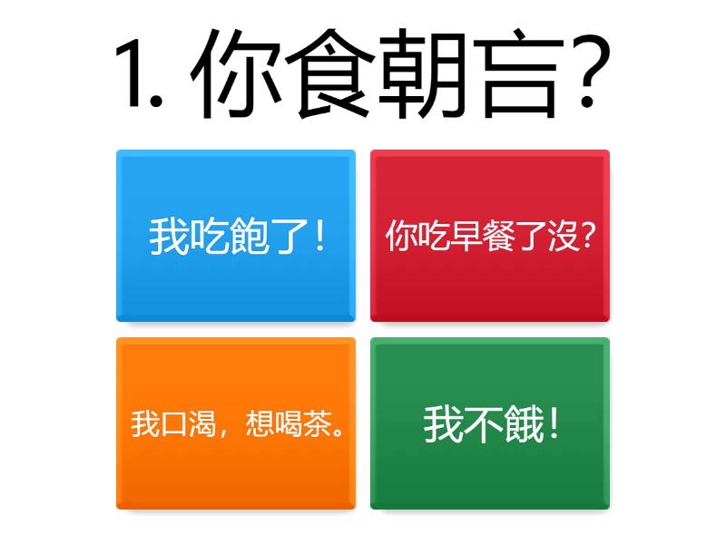 1) 1. 你食朝吂? a) 我吃飽了! b) 你吃早餐了沒? c) 我口渴,想喝茶。 d) 我不餓! 2) 2. 十二點,好食晝咧! a) 我吃飽了! b) 到小吃店去吃點心! c) 晚餐後一起去逛街好嗎? d) 12點,可以吃午餐了! 3) 3. 食飽夜共下來去逛街好無? a) 晚餐後一起去逛街好嗎? b) 大家一起去聚餐。 c) 好豐盛啊! d) 12點,可以吃午餐了! 4) 4. 來去點心店食點心! a) 你餓嗎? b) 你吃早餐了沒? c) 12點,可以吃午餐了! d) 到小吃店去吃點心! 5) 5. 你會肚屎枵無? a) 我吃飽了! b) 你要吃什麼? c) 你餓嗎? d) 不要吃太多! 6) 6. 𠊎毋會枵! a) 大家一起去聚餐。 b) 我不餓! c) 今晚到我家來吃飯! d) 你要吃什麼? 7) 7. 𠊎肚屎枵咧! a) 大家一起去聚餐。 b) 不要吃太多! c) 我不餓! d) 我肚子餓了! 8) 8. 𠊎食飽咧! a) 晚餐後一起去逛街好嗎? b) 我吃飽了! c) 這條魚很新鮮! d) 大家一起去聚餐。 9) 9. 你愛食麼个? a) 大家一起去聚餐。 b) 我不餓! c) 這條魚很新鮮! d) 你要吃什麼? 10) 10. 儘採! a) 我吃飽了! b) 隨便! c) 12點,可以吃午餐了! d) 你吃早餐了沒? 11) 11. 大家共下來去打鬥敘。 a) 我吃飽了! b) 這條魚很新鮮! c) 你要吃什麼? d) 大家一起去聚餐。 12) 12. 暗晡夜來𠊎屋下分𠊎請! a) 我吃飽了! b) 今晚到我家來吃飯! c) 到小吃店去吃點心! d) 隨便! 13) 13. 還豐沛喔! a) 你吃早餐了沒? b) 大家一起去聚餐。 c) 好豐盛啊! d) 你餓嗎? 14) 14. 莫食忒多! a) 不要吃太多! b) 好豐盛啊! c) 隨便! d) 到小吃店去吃點心! 15) 15. 這尾魚仔當萋! a) 這條魚很新鮮! b) 到小吃店去吃點心! c) 我吃飽了! d) 不要吃太多! 16) 16. 𠊎嘴渴,想食茶 a) 好豐盛啊! b) 今晚到我家來吃飯! c) 我口渴,想喝茶。 d) 大家一起去聚餐。