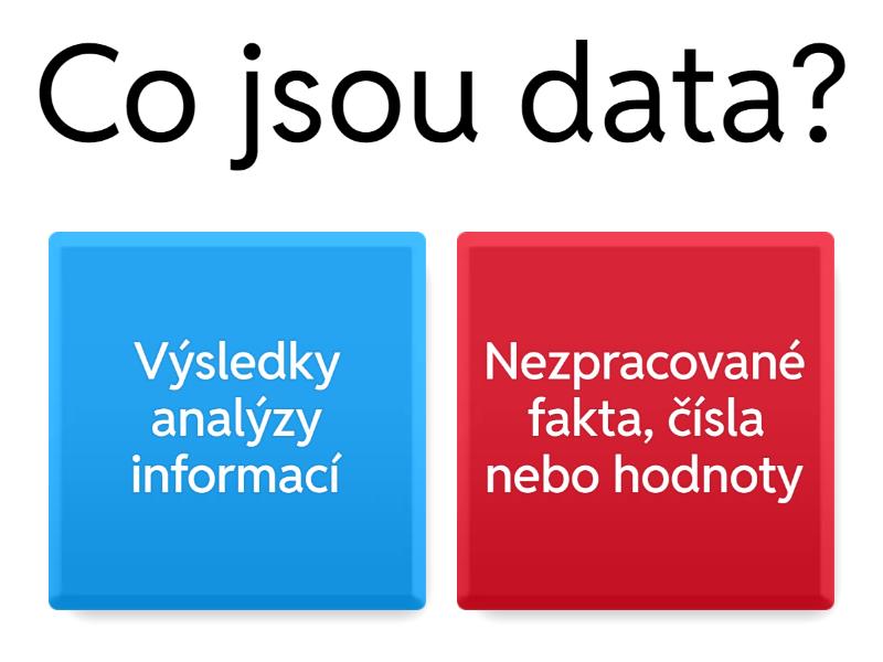 1) Co jsou data? a) Výsledky analýzy informací b) Nezpracované fakta, čísla nebo hodnoty 2) Jaký je rozdíl mezi daty a informacemi? a) Data jsou surová, informace jsou data zpracovaná a interpretovaná b) Data jsou názory, informace jsou fakta 3) Co je příkladem informace? a) 23, 45, 67 b) Graf zobrazující vývoj teploty s popisem trendu 4) Který z následujících procesů vede k vytvoření informace z dat? a) Sběr dat b) Analýza a interpretace dat 5) Proč je důležitá interpretace dat? a) Abychom mohli z dat vyvodit smysluplné závěry b) Abychom mohli data přepsat