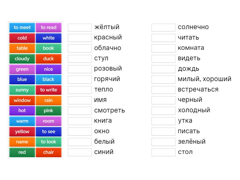 hot - горячий, cold - холодный, sunny - солнечно, warm - тепло, black - черный, red - красный, white - белый, yellow - жёлтый, nice - милый, хороший, blue - синий, green - зелёный, pink - розовый, chair - стул, table - стол, room - комната, window - окно, to look - смотреть, to read - читать, to see - видеть, to write - писать, book - книга, duck - утка, name - имя, cloudy - облачно, rain - дождь, to meet - встречаться,