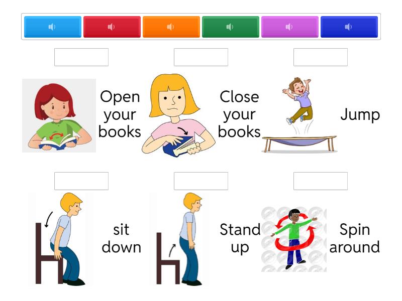 Stand up, sit down, Close your books, Open your books, Spin around, Jump,