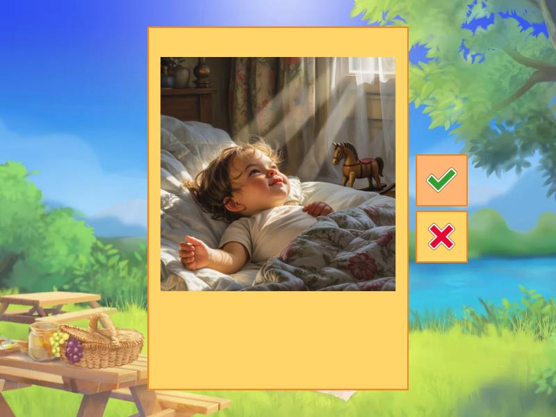 Выплыло на небо красное солнышко и стало рассыпать свои золотые лучи – будить землю., Первый луч полетел и попал на жаворонка., Жаворонок запел свою серебряную песенку., Второй луч попал на зайчика. Зайчик весело запрыгал по росистому лугу., Зайчик весело запрыгал по росистому лугу., Третий луч попал в курятник. Петух запел: "Ку-ку-ре-ку!", Четвёртый луч попал в улей., Полетела пчёлка собирать медок с душистых цветов., Пятый луч попал в детскую, на постельку к лентяю: режет ему прямо в глаза, а он повернулся на другой бок и опять заснул.,