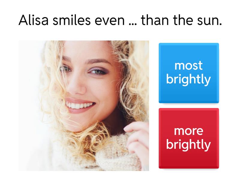 1) Alisа smiles even ... than the sun. a) most brightly b) more brightly 2) The new teacher explains the rules .... than our book. a) more completely b) completely 3) Jack arrived ... at the airport. a) latest b) most late 4) Jillian usually climbs .... of all the other climbers in her group. a) highest b) higher 5) Andrew is speaking even ... than usual. a) more louder b) louder 6) Melody dances .... of all the girls. a) most gracefully b) more gracefully 7) Of all three, Mike runs ... . a) fastest b) faster 8) This phrase is _______ used in spoken Russian than in written. a) more widely b) most widely c) widely 9) Your test isn’t good. You can do _______ than you did. a) better b) best c) gooder d) weller 10) We walk _______ than usual to catch the train. a) fast b) faster c) the fastest 11) I know Daniel _______ than you do. a) weller b) better c) the best 12) I used to play tennis _______ than now. a) oftener b) more often c) the most often
