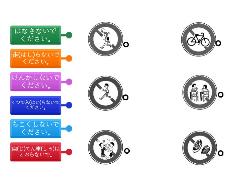 ちこくしないで ください。, 自(じ)てん車(しゃ)は とおらないで。, 走(はし)らないで ください。, はなさないで ください。, けんかしないで ください。, くつで入(はい)らないで ください。.