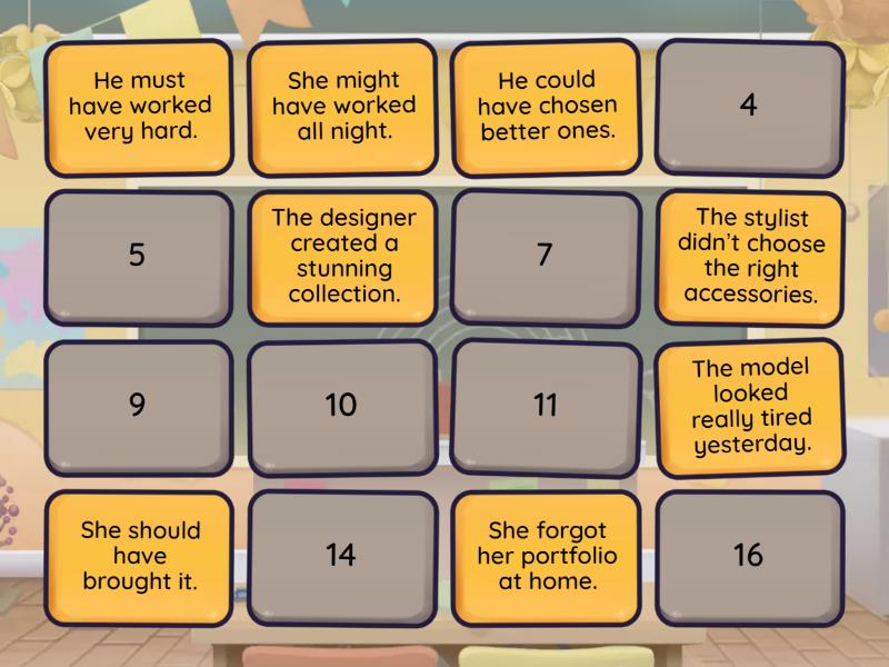 She forgot her portfolio at home. - She should have brought it., The designer created a stunning collection. - He must have worked very hard., The model looked really tired yesterday. - She might have worked all night., The stylist didn’t choose the right accessories. - He could have chosen better ones., The team arrived late to the fashion show. - They should have been on time., That dress looks like haute couture. - It must have been very expensive., The photographer missed the best moment. - He could have taken more photos., The fabric was damaged during the show. - Someone might have stepped on it.,