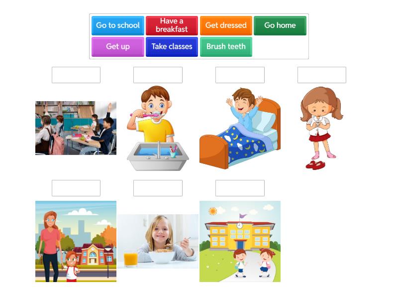Get up , Take classes , Get dressed , Go to school, Have a breakfast , Brush teeth , Go home ,