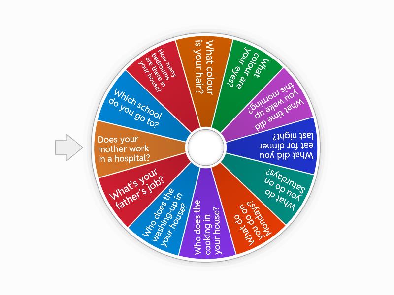 1) Which school do you go to? 2) How many bedrooms are there in your house? 3) What colour is your hair? 4) What colour are your eyes? 5) What time did you wake up this morning? 6) What did you eat for dinner last night? 7) What do you do on Saturdays? 8) What do you do on Mondays? 9) Who does the cooking in your house? 10) Who does the washing-up in your house? 11) What's your father's job? 12) Does your mother work in a hospital?