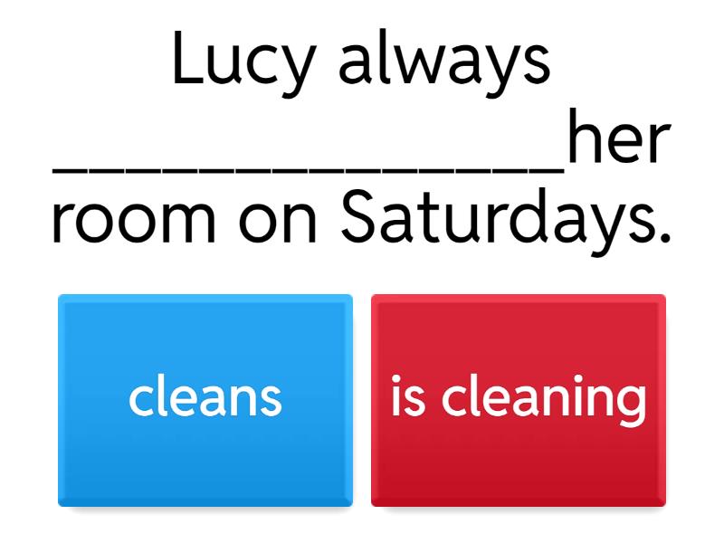 1) Lucy always ______________her room on Saturdays. a) cleans b) is cleaning 2) I can't come now. It ________________ heavily . a) rains b) is raining 3) Sometimes I ____________________ a bus to school. a) am taking b) take 4) Look! A rabbit _____________________ across the street. a) is running b) runs 5) We often ___________________________ on holidays to Italy. a) are going b) go 6) Mike ____________________ the web now. a) surfs b) is surfing 7) Jim _____________________ to gym on Mondays. a) isn't going b) doesn't go 8) Listen! Someone ___________________ the piano. a) is playing b) plays 9) __________ you eat pizza every day? a) Are b) Do 10) _______ the boys playing football at the moment? a) Are b) Do