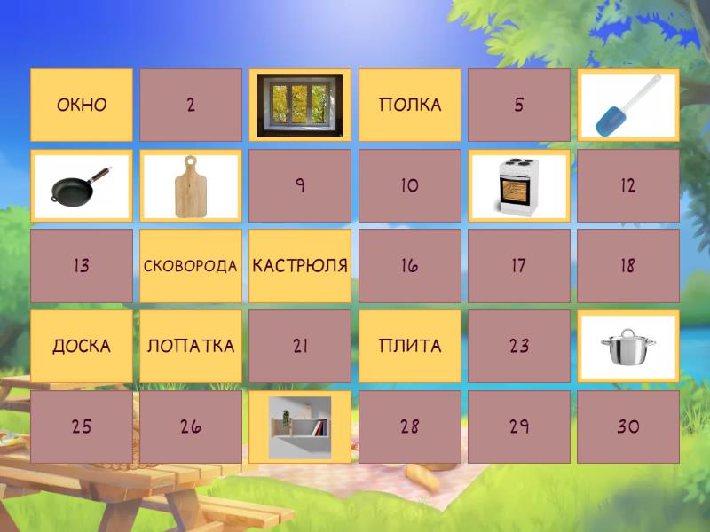 ПОЛКА, КАСТРЮЛЯ, СКОВОРОДА, ЛОПАТКА, ДОСКА, ОКНО, ПЛИТА, ШКАФ, ХОЛОДИЛЬНИК, РАКОВИНА, ДУХОВКА, МИКРОВОЛНОВКА, ПОЛОТЕНЦЕ, ПОДНОС, МЫЛО,