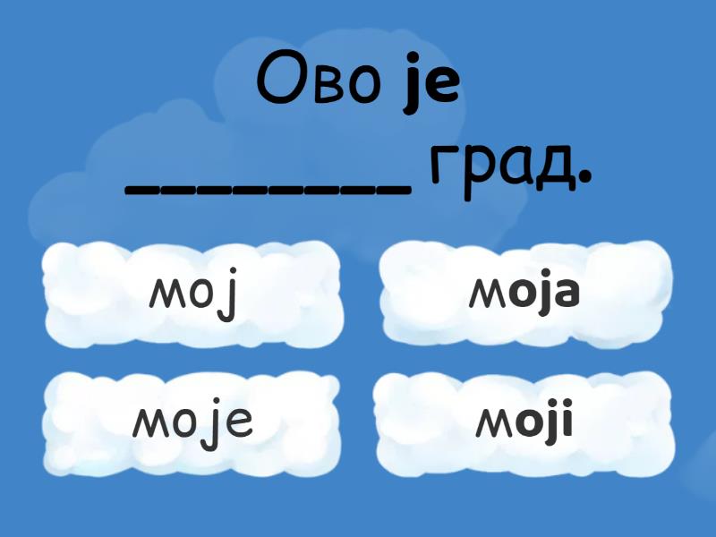 1) Ово je ________ град. a) мој b) мoja c) моје d) мoji 2) Oво je ______ кућа. a) мој b) моја c) моје d) моји 3) Ово је ________ мачка. a) твој b) твоја c) твоје d) твоји 4) Ово је _______ село. a) мој b) моја c) моје d) моји 5) Да ли су ово ____________ оловке? a) твој b) твоја c) твоје d) твоји 6) Да ли су ово __________ поклони? a) твој b) твоја c) твоје d) твоји 7) __________ сестре су у Немачкој. a) Мој b) Moja c) Moje d) Moji 8) ___________ одела су лепа. a) Твој b) Твоја c) Твоје d) Твоји 9) _________ пријатељи су далеко. a) Мој b) Моја c) Моје d) Моји 10) ________ породица је велика. a) Наш b) Наша c) Наши d) Наше 11) Да ли је ово _____ брат? a) ваш b) ваши c) ваша d) ваше 12) Ово је __________ школа. a) наш b) наша c) наши d) неше 13) Да ли су ово ________ пријатељи? a) ваш b) ваше c) ваши d) ваша 14) Да ли су ово _________ лопте? a) ваше b) ваши c) ваш d) ваша