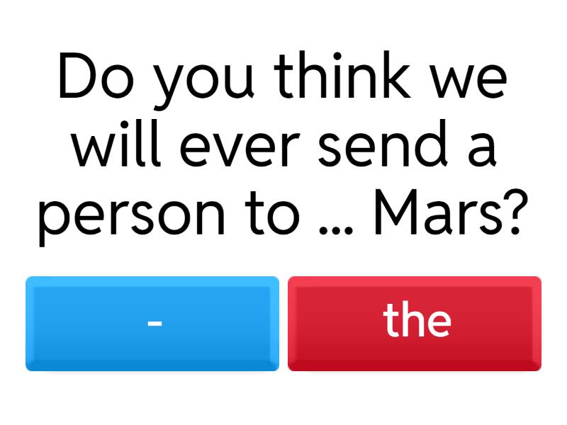 1) Do you think we will ever send a person to ... Mars? a) - b) the 2) When you go to .. London, don't forget to see ... London Eye. a) -, - b) -, the c) the, - d) the, the 3) I'm not telling _ lies. a) - b) the c) a d) an 4) Dad has gone to _ work and forgotten _ car keys. a) -, the b) -, - c) the, the d) the, - 5) I'm looking fror _ teacher who can teach me _ French. a) -, - b) the, the c) a, the d) a, - 6) __ prices have gone up a lot recently. a) - b) the c) a d) an 7) My brother is _ honest person. a) a b) an c) the d) - 8) _ English music was popular in _ America in _ 1960s. a) -, -, - b) the, the, the c) - , -, the d) the, -, - 9) Would you to read _ book or watch _ TV? a) a, - b) a, the c) the, the d) -, - 10) Peter joined _ police and caught ten thieves in his first month! a) - b) a c) the d) an