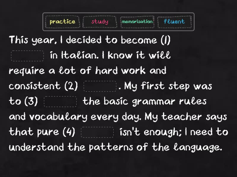 This year, I decided to become (1) ____ in Italian. I know it will require a lot of hard work and consistent (2) ____. My first step was to (3) ____ the basic grammar rules and vocabulary every day. My teacher says that pure (4) ____ isn't enough; I need to understand the patterns of the language. Sometimes, I do grammar (5) ____ online to test my knowledge. Last week, I made a silly (6) ____ in my (7) ____ by using the wrong verb tense. The teacher corrected it for me, highlighting the importance of (8) ____. To improve my (9) ____ and sound more natural, I try to listen to Italian music and podcasts. I also need to (10) ____ speaking every day, even if I'm alone! For tonight's (11) ____ , I have to write a short (12) ____ about my favourite holiday. I also need to (13) ____ a few sentences from English into Italian. The (14) ____ is often tricky because some words don't have a direct equivalent. Before the final (15) ____ next month, I will need to do a lot of (16) ____ to remember all the new words and complex grammar rules. I hope all this effort will lead to success!