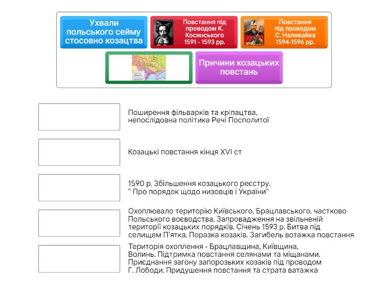 Повстання під проводом К. Косинського 1591 - 1593 рр. - Охоплювало територію Київського, Брацлавського. частково Польського воєводства. Запровадження на звільненій території козацьких порядків. Січень 1593 р. Битва під селищем П'ятка. Поразка козаків. Загибель вотажка повстання, Повстання під проводом С. Наливайка 1594-1596 рр. - Територія охоплення - Брацлавщина, Київщина, Волинь. Підтримка повстання селянами та міщанами. Приєднання загону запорозьких козаків під проводом Г. Лободи. Придушення повстання та страта ватажка, Причини козацьких повстань - Поширення фільварків та кріпацтва, непослідовна політика Речі Посполитої, Ухвали польського сейму стосовно козацтва - 1590 р. Збільшення козацького реєстру. " Про порядок щодо низовців і України", Козацькі повстання кінця XVI ст,