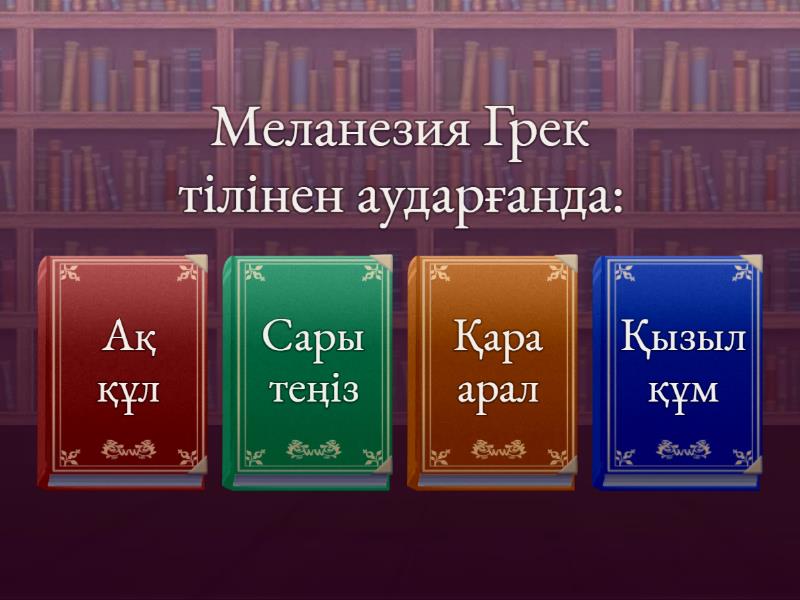 1) Меланезия Грек тілінен аударғанда: a) Ақ құл b) Сары теңіз c) Қара арал d) Қызыл құм 2) Меланезияні тікелей зерттеген ғалым кім? a) Фернан Магелан b) Миклуха Маклай c) Те Ранги Хирао d) Александр Невский 3) Меланезиялықтар неше аралдық топқа бөлінді? a) 4) Соломон,Апенин,Бисмарк,Ява b) 3) Соломон,Фиджи,Коледония c) 7)Ақ,қара,сары,көк,қызыл,сұр, күлгін нәсілді d) 5) Бисмарк,Соломон,Жаңа Гебридтер,Жаңа Коледония,Фиджи 4) Меланезияның ауа-райы қандай белдеуде орналасқан? a) Қоныржай b) Тропиктік c) Субтропиктік d) Шөлейт 5) Меланезияның негізгі кемесі неше м? a) 10м b) 7м c) 8м d) 9м