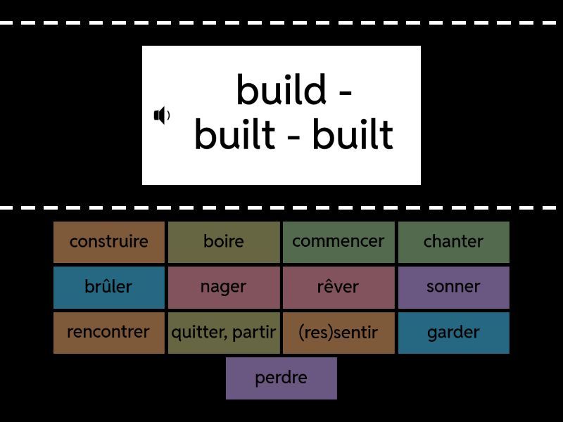 construire - build - built - built, commencer - begin - began - begun, brûler - burn - burnt - burnt, boire - drink - drank - drunk, rêver - dream - dreamt - dreamt, sonner - ring - rang - rung, (res)sentir - feel - felt - felt, chanter - sing - sang - sung, garder - keep - kept - kept, quitter, partir - leave - left - left, nager - swim - swam - swum, perdre - lose - lost - lost, rencontrer - meet - met - met,