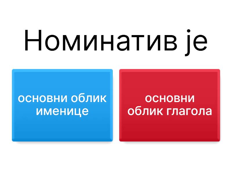 1) Номинатив је a) основни облик именице b) основни облик глагола 2) Номинатив се добија на питање: a) кога/шта? b) ко/шта? 3) Уз номинатив a) стоје предлози b) не стоје предлози 4) Номинатив у реченици има службу a) субјекта и именског дела предиката b) субјекта и предиката 5) У номинативу, у служби субјекта у реченици може да се нађе: a) једна реч или скуп речи b) само једна реч 6) Именске речи се у речнику налазе у: a) било ком падежу b) у номинативу 7) Одабери речи које се налазе у номинативу: a) девојчице, дечаци, цвеће, грожђе, пилад b) девојчицама, дечаке, цвећу, грођже, пилад