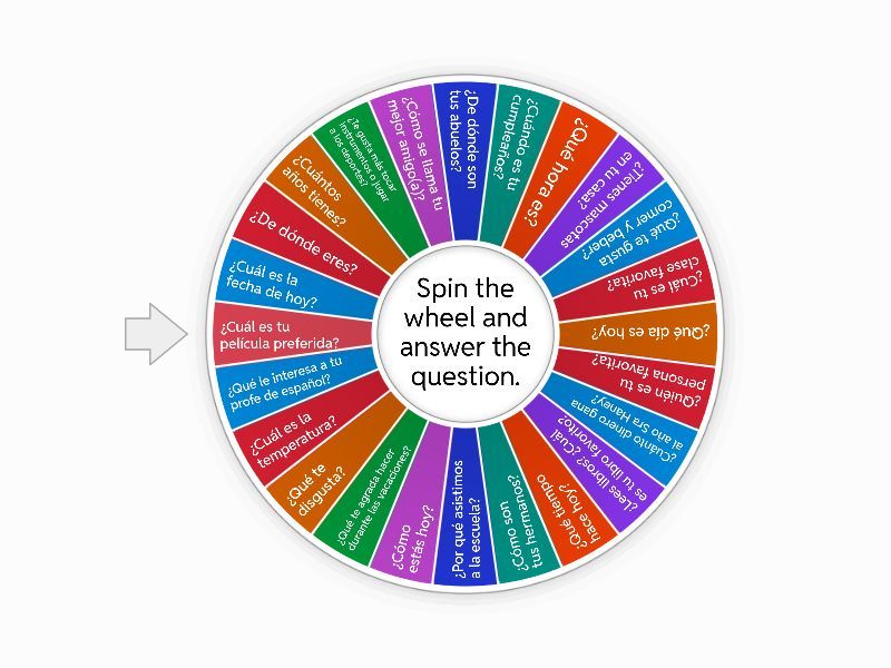 ¿Cuál es la fecha de hoy?, ¿De dónde eres?, ¿Cuántos años tienes?, ¿Te gusta más tocar instrumentos o jugar a los deportes?, ¿Cómo se llama tu mejor amigo(a)?, ¿De dónde son tus abuelos?, ¿Cuándo es tu cumpleaños?, ¿Qué hora es?, ¿Tienes mascotas en tu casa?, ¿Qué te gusta comer y beber?, ¿Cuál es tu clase favorita?, ¿Qué día es hoy?, ¿Quién es tu persona favorita?, ¿Cuánto dinero gana al año Sra Haney?, ¿Lees libros? ¿Cuál es tu libro favorito?, ¿Qué tiempo hace hoy?, ¿Cómo son tus hermanos?, ¿Por qué asistimos a la escuela?, ¿Cómo estás hoy?, ¿Qué te agrada hacer durante las vacaciones?, ¿Qué te disgusta?, ¿Cuál es la temperatura?, ¿Qué le interesa a tu profe de español?, ¿Cuál es tu película preferida?.