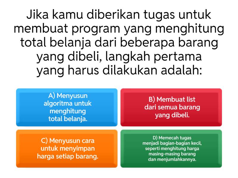 1) Jika kamu diberikan tugas untuk membuat program yang menghitung total belanja dari beberapa barang yang dibeli, langkah pertama yang harus dilakukan adalah: a) A) Menyusun algoritma untuk menghitung total belanja. b) B) Membuat list dari semua barang yang dibeli. c) C) Menyusun cara untuk menyimpan harga setiap barang. d) D) Memecah tugas menjadi bagian-bagian kecil, seperti menghitung harga masing-masing barang dan menjumlahkannya. 2) Saat menyusun algoritma untuk menghitung jumlah angka dalam sebuah daftar, kamu menyadari bahwa setiap angka dalam daftar bertambah satu setelah angka sebelumnya. Ini adalah contoh dari: a) A) Dekomposisi b) B) Pengenalan Pola c) C) Abstraksi d) D) Algoritma 3) Jika kamu ingin membuat algoritma untuk mencari angka terbesar dalam daftar, langkah pertama yang perlu dilakukan adalah: a) A) Membandingkan setiap angka dengan angka lainnya untuk menemukan yang terbesar. b) B) Mengurutkan angka-angka dalam daftar c) C) Menambahkan semua angka dalam daftar. d) D) Mencari angka terkecil dalam daftar terlebih dahulu. 4) Kamu ingin membuat roti bakar. Manakah urutan yang tepat jika kamu menyusun algoritma untuk membuat roti bakar? a) A) Olesi mentega, masukkan roti, bakar roti b) B) Potong roti, simpan di lemari, lalu bakar c) C) Bakar roti, keluarkan roti, lalu masukkan ke toaster d) D) Makan dulu, baru buat roti 5) Kamu selalu meletakkan kunci motor di meja dekat pintu. Suatu hari, kamu tidak menemukannya di sana. Langkah paling logis untuk menemukan kunci berdasarkan berpikir komputasional adalah: a) A) Panik dan menyalahkan orang lain b) B) Membeli kunci baru c) C) Mencoba mengingat dan mengecek tempat-tempat yang biasa kamu kunjungi sebelumnya d) D) Menunggu sampai kunci muncul sendiri 6) Dalam game Blockly, jika kamu ingin membuat karakter bergerak maju 5 langkah secara berulang, blok perulangan mana yang paling tepat? a) A) repeat (5) { move forward 1 step } b) B) repeat (1) { move forward 5 steps } c) C) move forward 5 steps d) D) if (condition) { move forward 1 step } 7) Jika kamu ingin karakter berhenti bergerak ketika menabrak tembok, blok mana yang bisa digunakan? a) A) if (wall detected) { stop moving } b) B) if (wall detected) { turn right 90 degrees } c) C) move forward 1 step d) D) repeat (until wall detected) { move forward 1 step } 8) Apa tujuan dari menggunakan variabel dalam Blockly? a) A) Mengatur urutan blok dalam program. b) B) Menyimpan nilai yang bisa digunakan di berbagai bagian program. c) C) Menambah blok kosong dalam program d) D) Mengulang blok tanpa batas. 9) Jika kamu ingin karakter bergerak maju selama 10 langkah menggunakan perulangan, blok mana yang tepat? a) A) repeat (10) { move forward 10 steps } b) B) repeat (10) { move forward 1 step } c) C) move forward 10 steps d) D) if (steps < 10) { move forward 1 step } 10) Kamu ingin membuat secangkir teh. Apa langkah pertama yang dilakukan jika kamu menerapkan dekomposisi dalam proses membuat teh? a) A) Menuangkan teh ke dalam cangkir b) B) Memasukkan gula ke dalam cangkir c) C) Memecah proses menjadi langkah-langkah kecil seperti: memanaskan air, menyiapkan cangkir, dan menyeduh teh d) D) Meminum teh