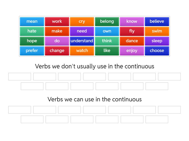 Verbs we donʼt usually use in the continuous: believe , hope , know, like , own , think , understand, belong, mean, hate, need, prefer, enjoy, Verbs we can use in the continuous: dance, swim, cry, choose, change, do, watch, work, make, fly, sleep,
