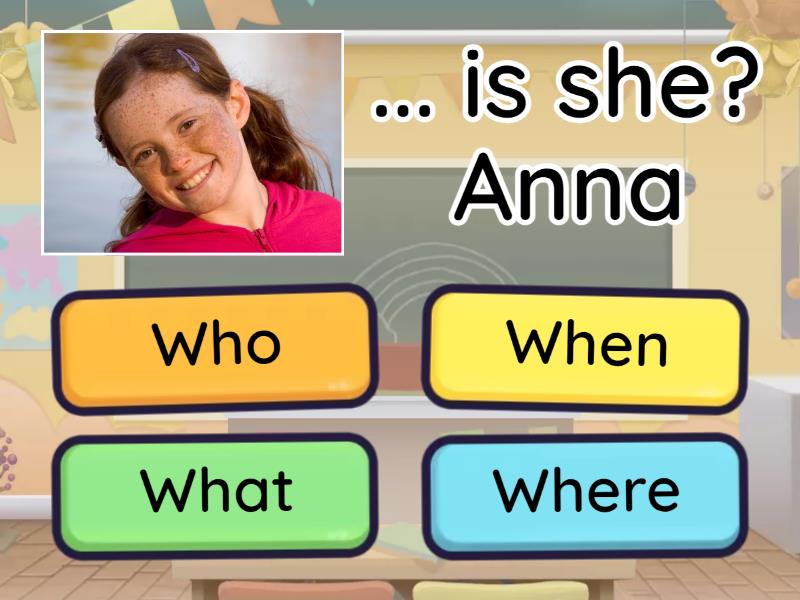 1) ... is she? Anna a) Who b) When c) What d) Where 2) ... does she come? Tomorrow. a) Who b) When c) What d) Where 3) ... is she now? She is in school. a) Who b) When c) What d) Where 4) ... is it? It's a lorry. a) Who b) When c) What d) Where 5) ... are you leaving? On Monday. a) Who b) When c) What d) Where 6) ... is ringing the bell? The postman. a) Who b) When c) What d) Where 7) ... is my pencil? There. a) Who b) When c) What d) Where 8) ... time is it? It's three o'clock. a) Who b) When c) What d) Where 9) ... are they? Anna and Lisa. a) Who b) When c) What d) Where 10) ... did you arrive? Yesterday. a) Who b) When c) What d) Where 11) ... do you live? In London. a) Who b) When c) What d) Where 12) ... did you buy? Sunglasses. a) Who b) When c) What d) Where