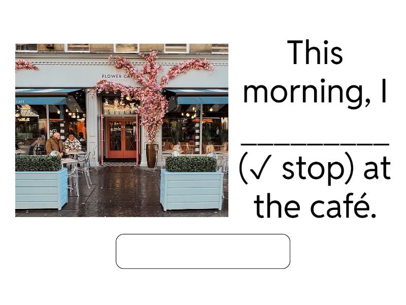Yesterday, I _________ (✓ play) the violin., Yesterday, I _________ (✗ play) the drums., Last weekend, I _________ (✓ visit) an art gallery., Last weekend, I _________ (✗ visit) my grandparents., This morning, I _________ (✓ stop) at the café., Last week, I _________ (✗ dance) at the party..