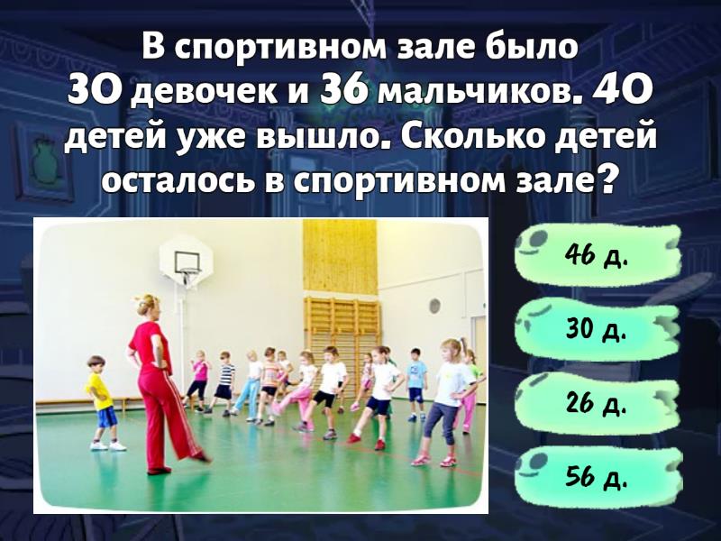 1) В спортивном зале было 30 девочек и 36 мальчиков. 40 детей уже вышло. Сколько детей осталось в спортивном зале? a) 46 д. b) 30 д. c) 26 д. d) 56 д. 2) В магазин привезли 35 красных шариков и 40 синих. Продали 50 шариков. Сколько шариков осталось? a) 20 ш. b) 30 ш. c) 45 ш. d) 25 ш. 3) В одной коробке было 10 карандашей, в другой - 28 . На сколько меньше было карандашей в первой коробке? a) на 38 к. b) на 18 к. c) на 25 к. d) на 48 к. 4) В одном автобусе ехали 40 туристов, в другом - на 10 туристов меньше. Сколько всего туристов ехали в двух автобусах? a) 30 т. b) 50 т. c) 70 т. d) 90 т. 5) Сначала в море ушло 9 лодок, потом ещё 5 лодок. Сколько лодок ушло в море? a) 4 л. b) 14 л. c) 15 л. d) 18 л. 6) В одном гараже стояло 47 машин, а во втором на 17 машин меньше. Сколько всего машин стояло в двух гаражах? a) 30 м. b) 40 м c) 77м d) 87 м. 7) На одной клумбе росло 36 цветов, а на второй - на 16 цветов меньше. Сколько всего цветов росло на двух клумбах? a) 20 цв. b) 66 цв. c) 56 цв. d) 75 цв.