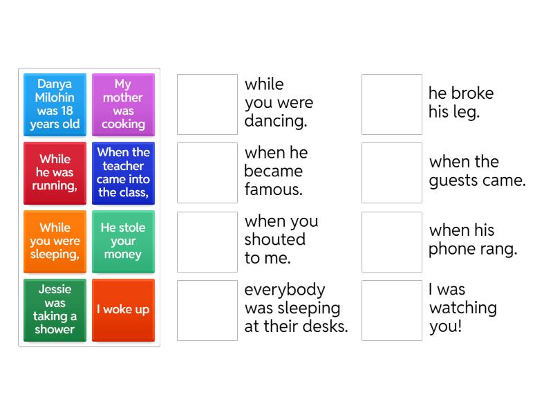 While he was running, - he broke his leg., Jessie was taking a shower - when his phone rang., My mother was cooking - when the guests came., While you were sleeping, - I was watching you!, I woke up - when you shouted to me., He stole your money - while you were dancing., Danya Milohin was 18 years old - when he became famous., When the teacher came into the class, - everybody was sleeping at their desks.,
